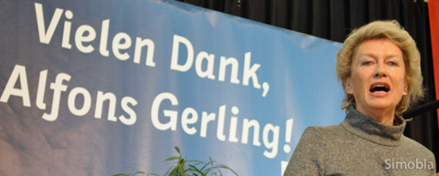 Kurz vor seinem Ausscheiden aus dem Landtag gab er einen Abschiedsempfang in der Stadthalle Zeilsheim – in „seiner“ Stadthalle, der „Alfons-Gerling-Stadthalle“, wie die frühere Frankfurter Oberbürgermeisterin Petra Roth sagte. Dass sie gebaut wurde, ist maßgeblich sein Verdienst. Petra Roth ist wie Gerling Jahrgang 1944 und ging ab 1977 einen großen Teil des politischen Wegs gemeinsam mit ihm. „So altert man durch in der Politik, vom kämpferischen Jung-Politiker zur Senioren-Union“, scherzte sie. Vor allem hob sie die Einführung des „Frankfurter Modells“ in der Drogenpolitik 1993 hervor. Dass dieser wegweisende Umgang mit Drogenkranken gegangen werden konnte, sei nicht zuletzt Alfons Gerling zu verdanken. Als Sozialpolitiker mit christlichen Werten habe für ihn stets der Mensch im Mittelpunkt allen Handelns gestanden. So steht es auch auf seiner Internet-Heimseite: „Ich habe mir zum Ziel gemacht, mich für andere einzusetzen“. „Das ist ihm vorbildlich gelungen“, lobte Hessens Ministerpräsident Volker Bouffier. Obwohl der „Löwe von Zeilsheim“ nie ein Mann des lauten Wortes war, habe man ihm immer zugehört, wenn er etwas zu sagen hatte – eben weil er etwas zu sagen hatte. „Er ist beliebt, aber nie beliebig“, sagte Bouffier. Sein Ansehen gehe weit über die eigenen Reihen hinaus. „Alfons Gerling hat Politik so gelebt, wie sie sein sollte: Nah bei den Menschen und für die Menschen“, bescheinigte ihm auch Uwe Becker. CDU-Kreisvorsitzender und Frankfurter Kämmerer.